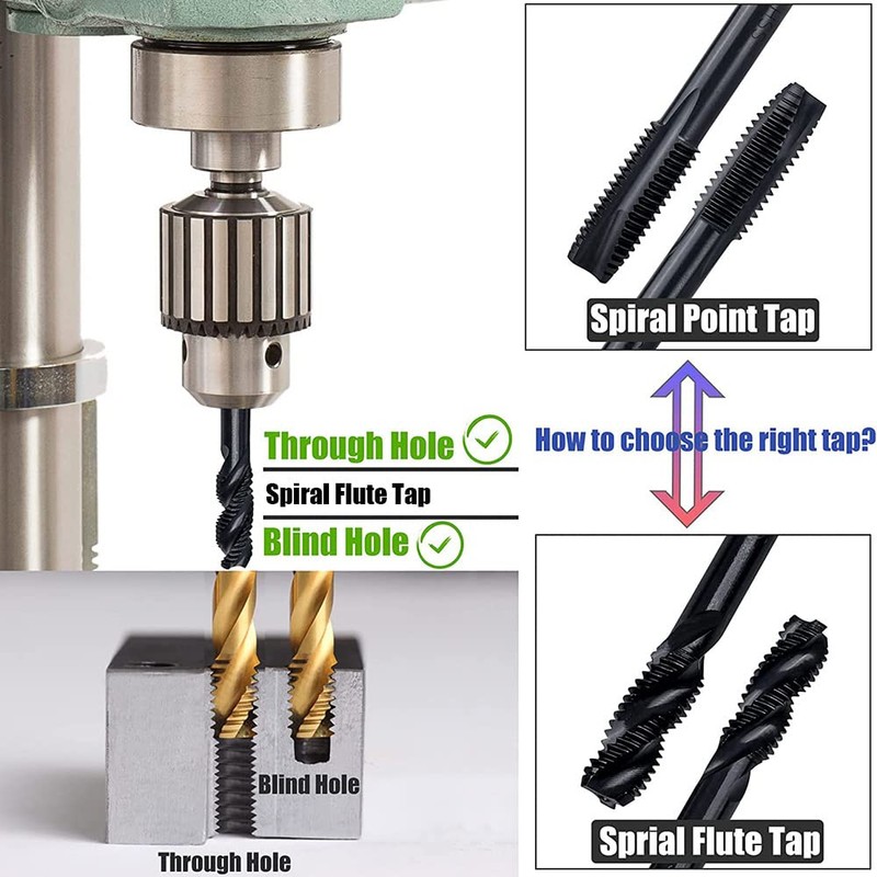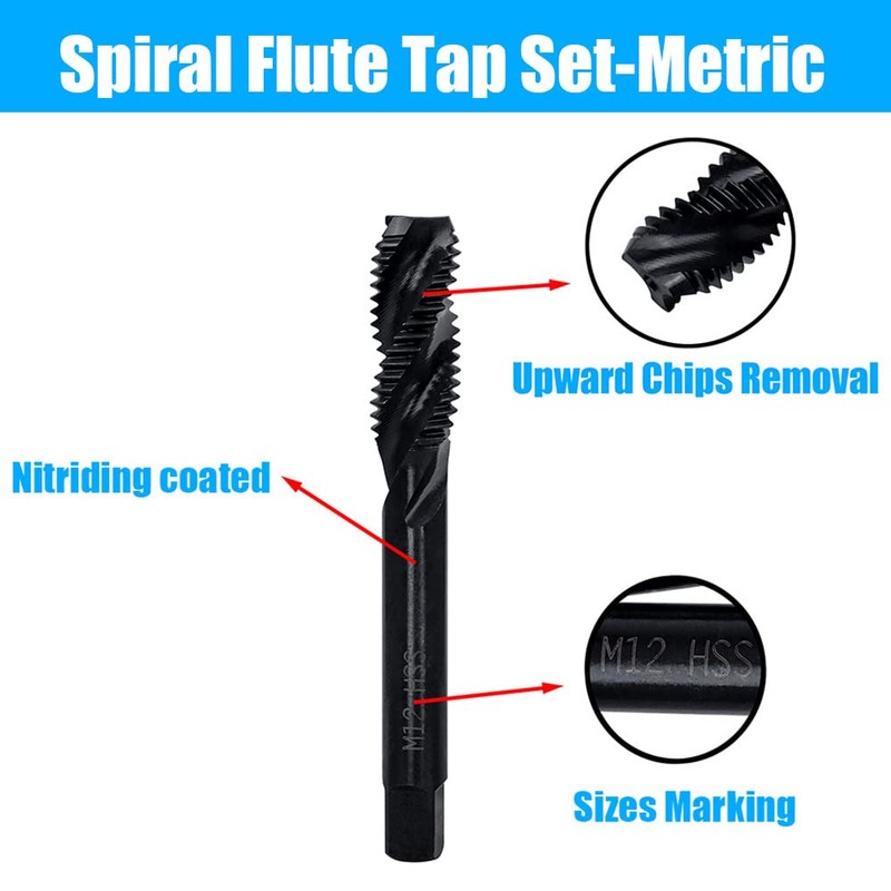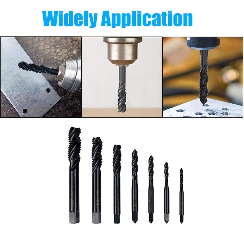 - 5. Widely Application: The spiral flute tap set is suitable for use on a variety of materials, including steel, aluminum, copper, brass, and other metals, as well as plastics and other materials. Widely used to drilling, tappingSpiral flute design, upward chip removal, right-hand thread cutting, clear threads with no burrs, fast tapping with accuracy.
