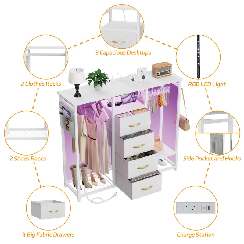 YAKANJ Dresser for Bedroom with 2 Clothes Racks,4 Drawer Dresser with Led Light and Charging Station,White Dresser with Hanging Rack,Dresser with Side Pocket and Hooks,White
