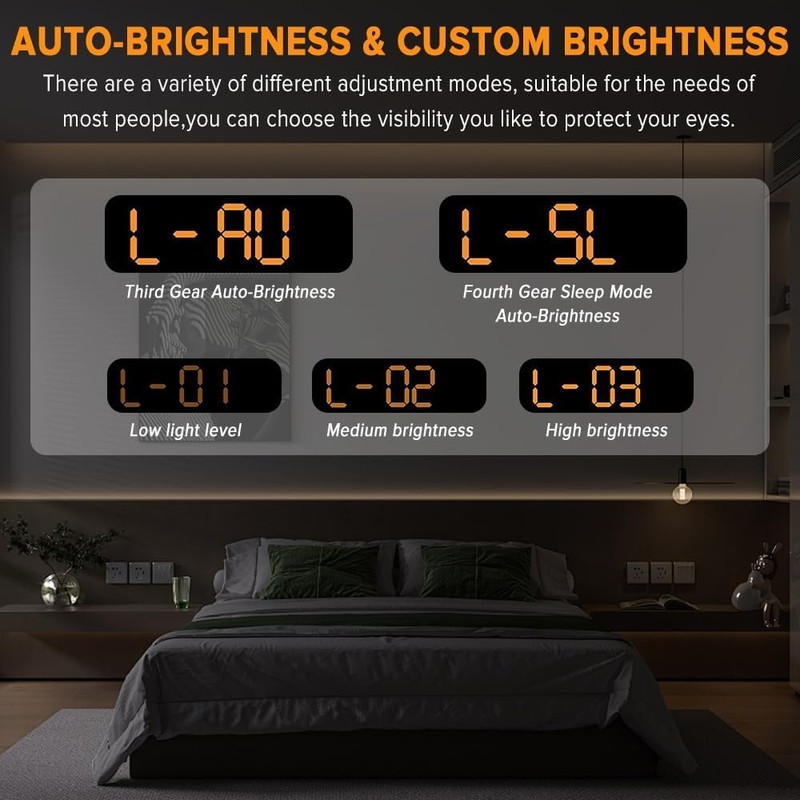 • ⏰【Automatic/Manual Brightness Dimmer】 Yakiter the led digital wall clock has a built-in light sensor and contains 3 modes, sleep mode light-sensitive, automatic and manual mode to adjust the brightness. No need to worry about the brightness, either too bright thus affecting your sleep or too dim to read time.