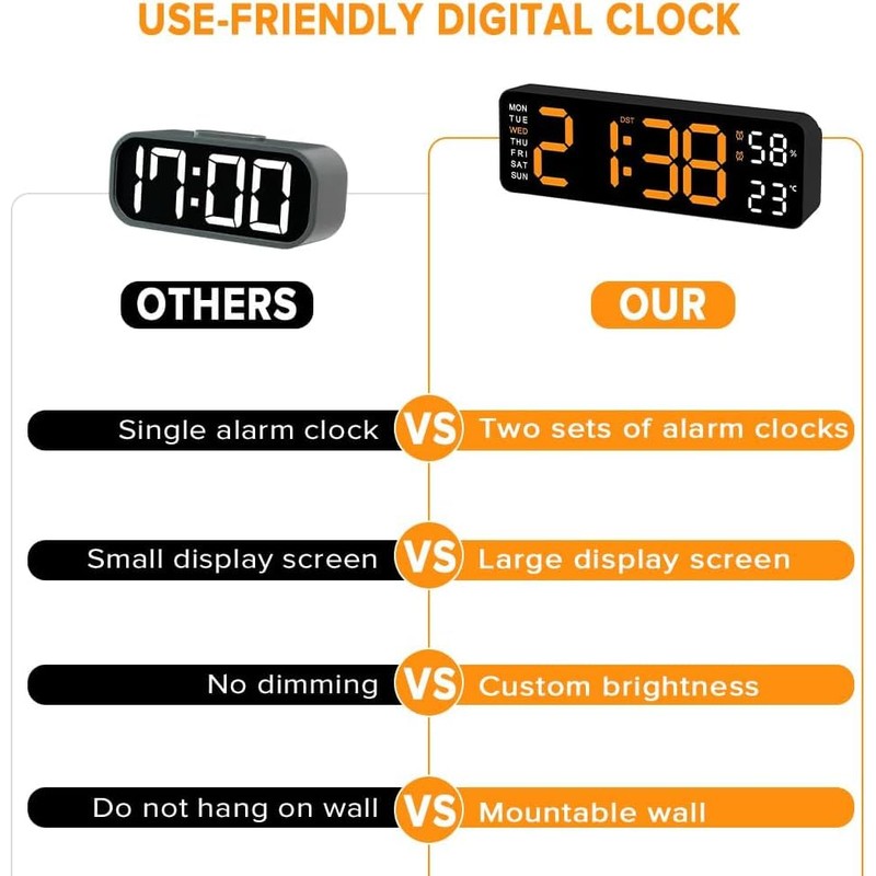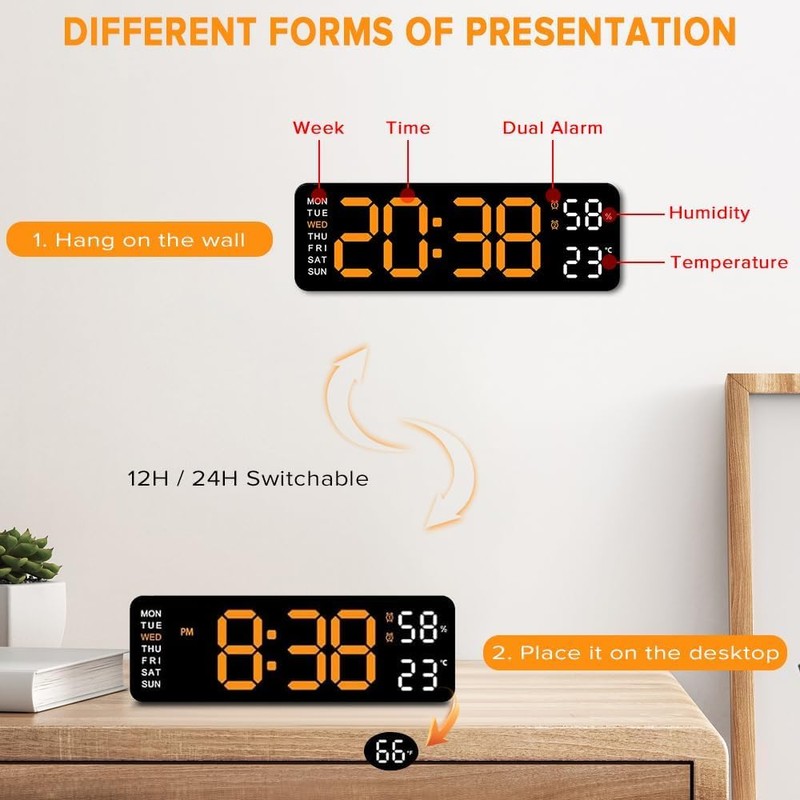 • ⏰【Multi-Function】 The digital clock wall has multiple functions: automatic photosensitive, time, calendar, week, °C/°F, humidity, DST, Dual Alarm, 12/24H, snooze, among them, time, week, temperature, and humidity are displayed in the same frequency, the date jumps to the display.