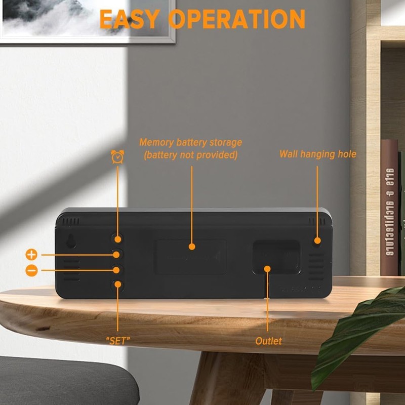 LED digital clock is not battery powered, you need to connect the USB port to power on (USB cable and adapter included) for the clock to display properly, but there is a memory battery compartment behind the clock (batteries are not included and A pair of 1.5V AAA batteries is required), you need to place batteries to achieve the time memory function. The led clock digital can be used as desk clock digital and can also be hung on the wall as wall mount digital clock (two nails included), suitable for all indoor occasions, such as bedroom, living room, kitchen, office, bathroom, hotel and so on.