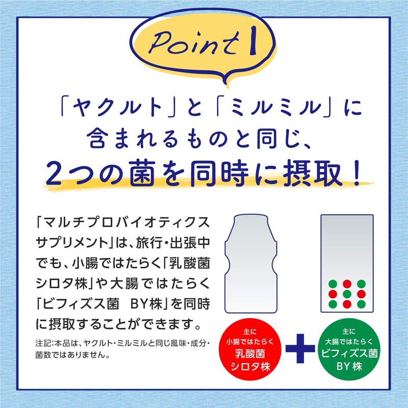 - 【ヤクルトだからこそ作ることが出来たサプリメント】ヤクルト類に入っている「乳酸菌 」とミルミル類に入っている「ビフィズス菌」2種類の生菌を同時に摂取出来ます。ヤクルトだからこそ作ることが出来たサプリメントです。