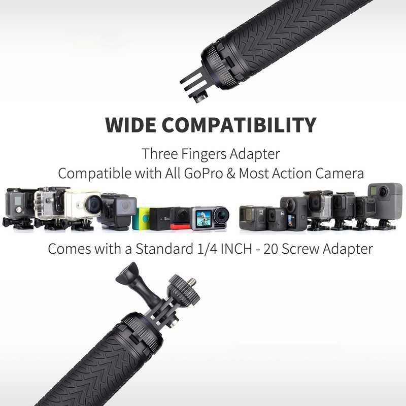 - Compatibility: The monopod stick and the floating hand grip are compatible with all GoPro and most action cameras that own 2 fingers mount. Such as GoPro Hero 12 11 10 9 8 7 6 5 4 3 3+ 2 Black Silver White Session Fusion Max Mini (2018) DJI OSMO Action SJCAM, etc. With the 1/4" adapter, it also fit for the most digital camera