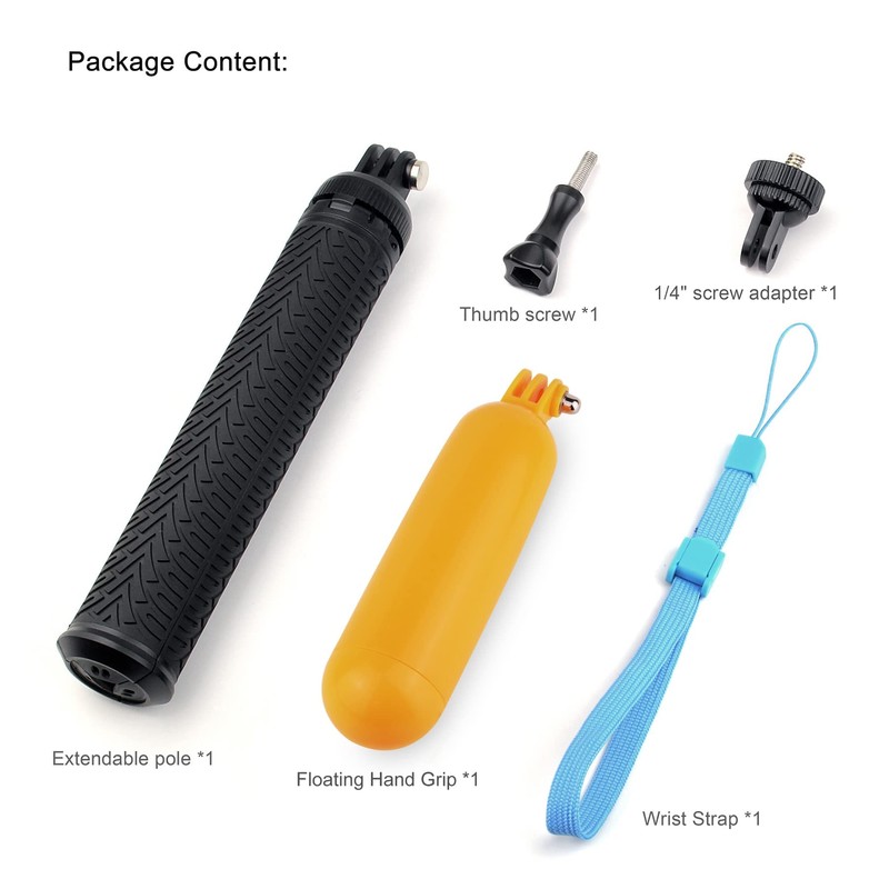 - Package Includes: 1x Extendable pole, 1x Floating grip, 1x 1/4" Screw adapter, 1x Thumb screw, 1x Wrist strap