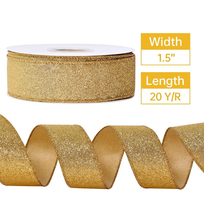 YAMA Glitter Wired Ribbon, Gold, 1-1/2 inch x 20 Yards, for Christmas, Gift Wrapping, Wreath, Crafts, Bow Making and Party Decoration