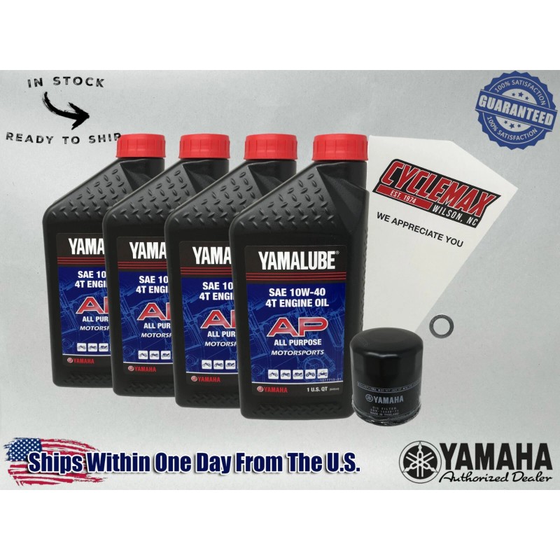 - CYCLEMAX OIL CHANGE KIT INCLUDES: Four Yamaha LUB-10w40-AP-12 Yamalube 10W40 Quarts of Oil, One Yamaha 5GH-13440-71-00 Oil Filter, One 14mm Drain Plug Crush Washer and a Convenient Disposable Funnel.
