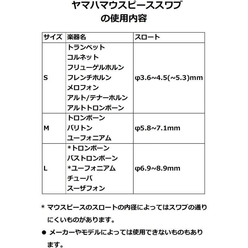 - Swabs for mouthpiece conduit instruments. Can be used for trombone, bustrombone, euphonium, tuba, suzaphone, etc. Trombone and Euphonium are difficult to get through depending on the inner diameter of the mouthpiece throat. Some products cannot be used depending on the manufacturer or model