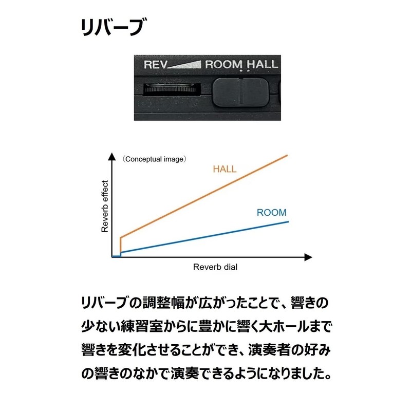 - The reverb adjustment is expanded, allowing you to change the sound from a low-sound practice room to a rich large hole