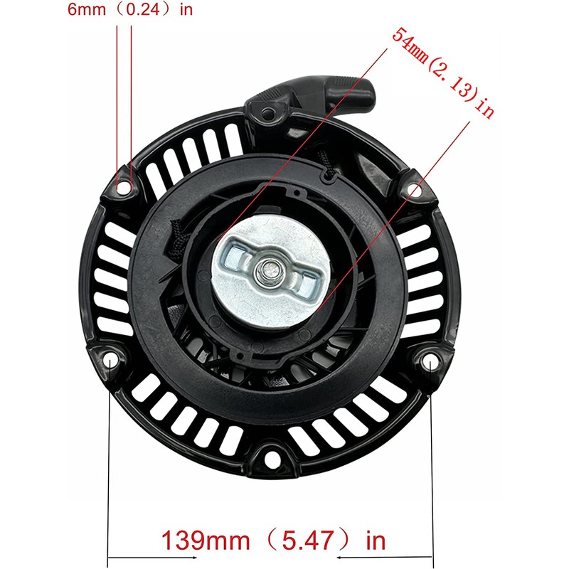 - The BS recoil pull starter assembly is black color, iron plate pawl, and it comes with an OEM nylon 66 pull rope. The diameter of the rachet and the plastic housing is 54mm/75mm. Center to center of bolt hole is 139mm( triangle pattern), 160mm(hole to hole center through starter centrer point).