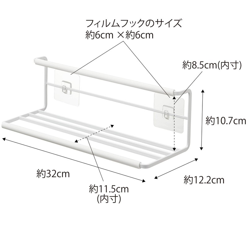 - Product Size (W x D x H): Approx. 12.6 x 4.8 x 4.2 inches (32 x 12.2 x 10.7 cm) (not including film hook); Film Hook Adhesive Surface: Approx. W 2.4 x H 2.4 inches (6 x 6 cm) (per piece); Inner Dimensions: Rack Portion: Approx. 12.6 x 4.5 inches (3.3.3.3 x 3.3 x 3 inches (3.3 x