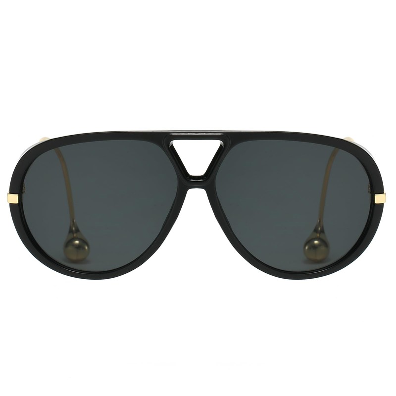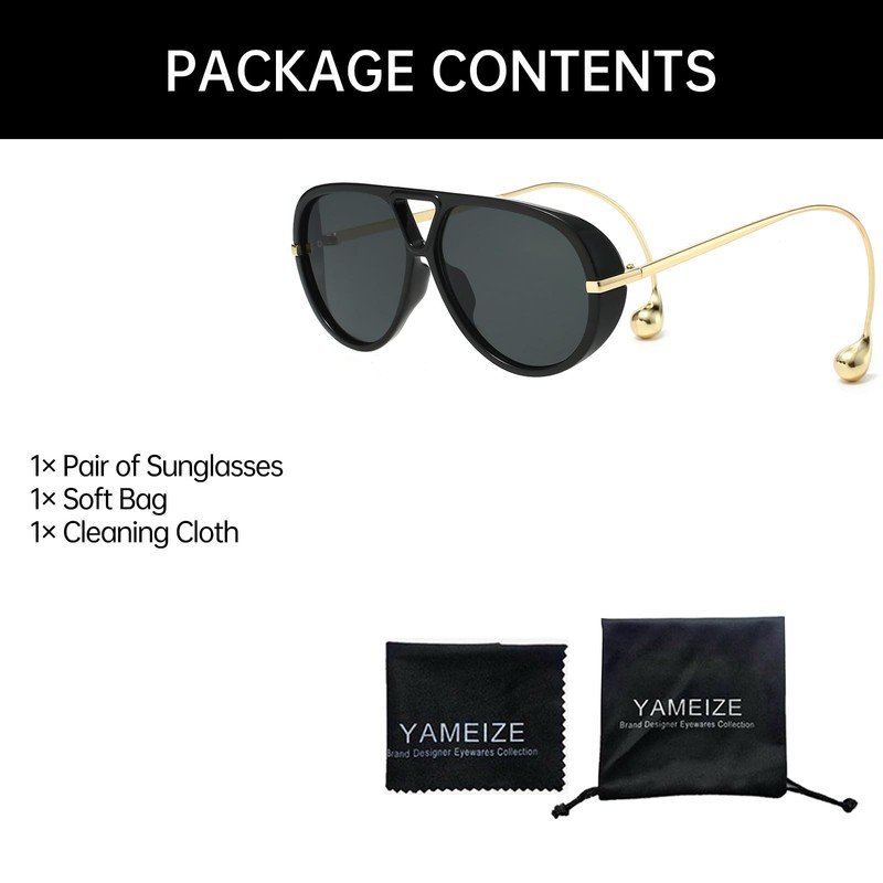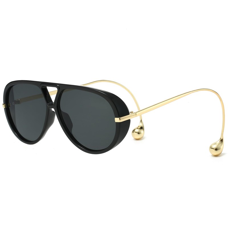 YAMEIZE Oversized Pilot Sunglasses for Women Men Retro 70s Double Bridge With Earring Round Shield Big Sun Glasses UV400 (BlackGrey)
