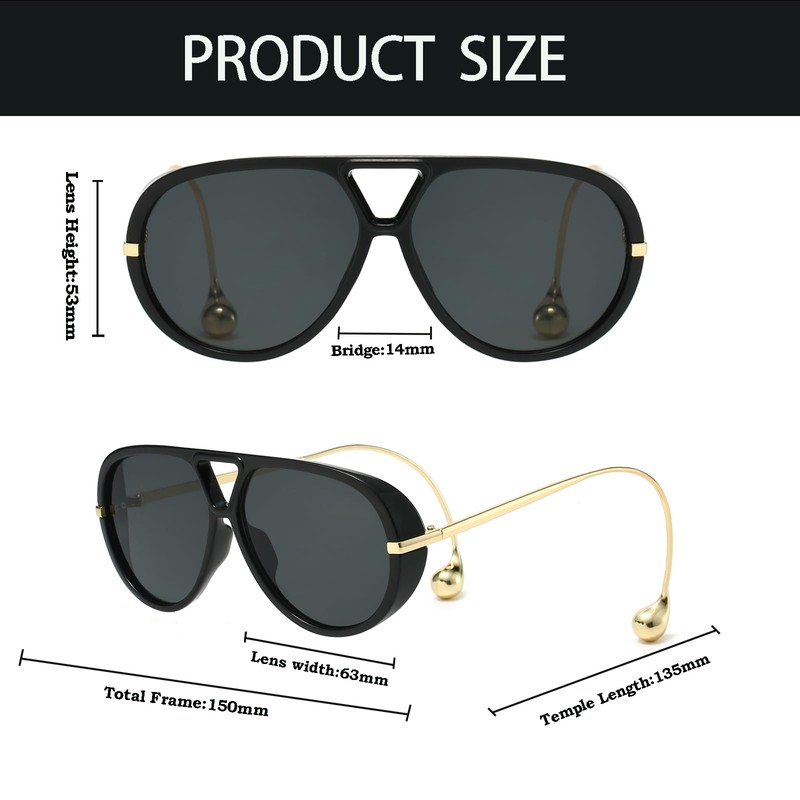 - SUNGLASSES SIZE&PACKAGE: Len height:53mm(2.1 inch),len width:63mm(2.48 inch),bridge width:14mm(0.55 inch), frame width:150mm(5.91 inch),leg length:135mm(5.31 inch).PACKAGE INCLUDE:1 cleaning cloth & 1 Sunglasses soft bag & 1 sunglasses.Our sunglasses are relatively large, please confirm the size and place an order