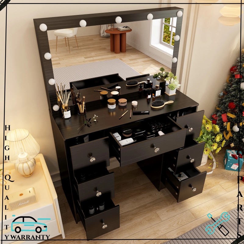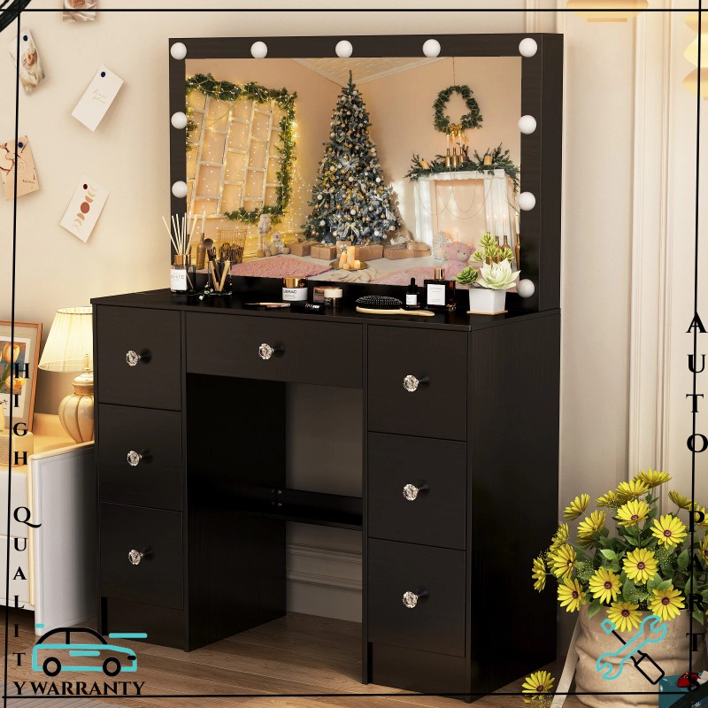 Yamissi Modern Black Dressing Table with Hollywood LED Mirror Large 7 Drawers Vanity Set