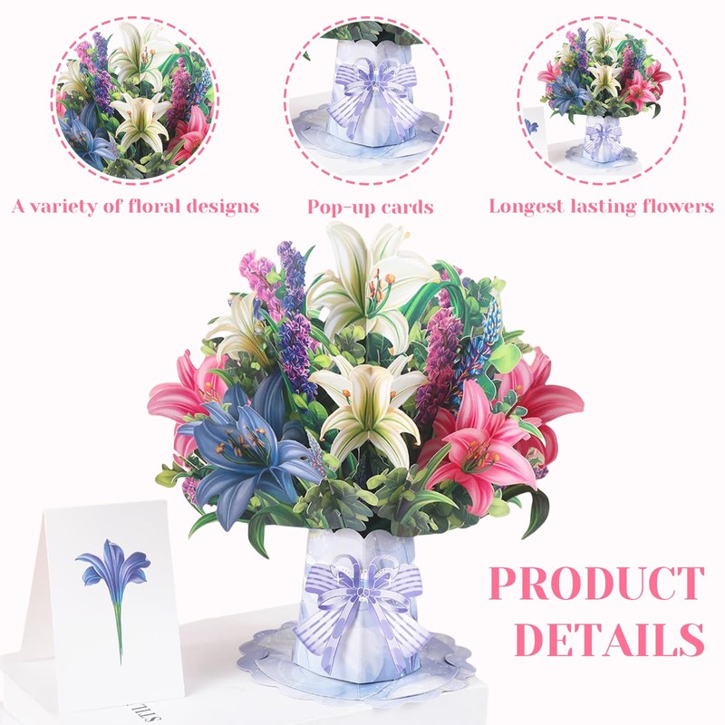 • 【No Watering Needed】: Different from real flowers, our bouquet pop up does not require maintenance and still remains beautiful forever. The card is 11.4 inches high and can be placed in a special paper vase, making it a durable, unique gift.