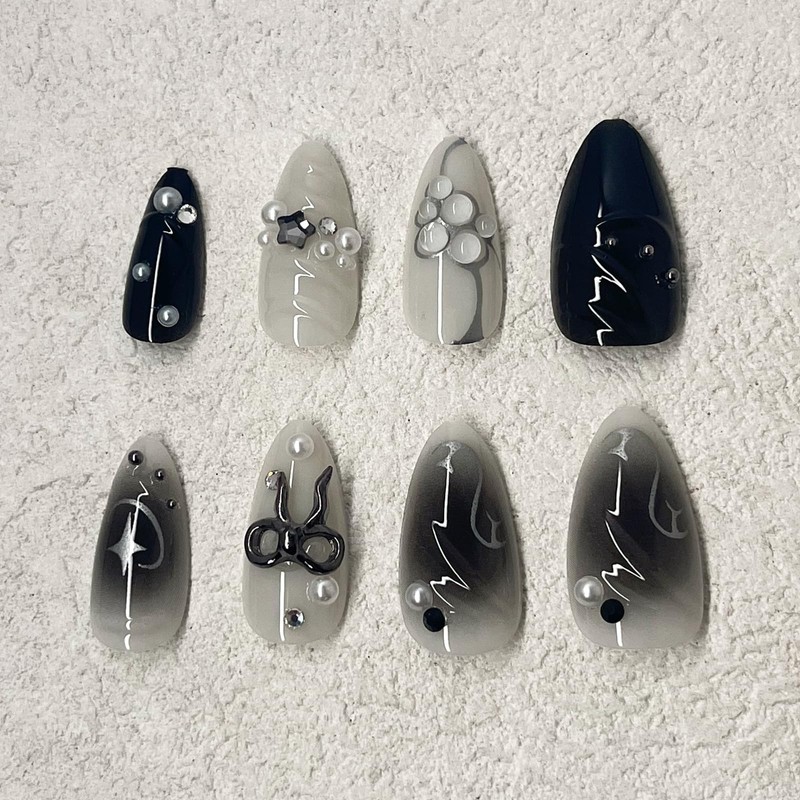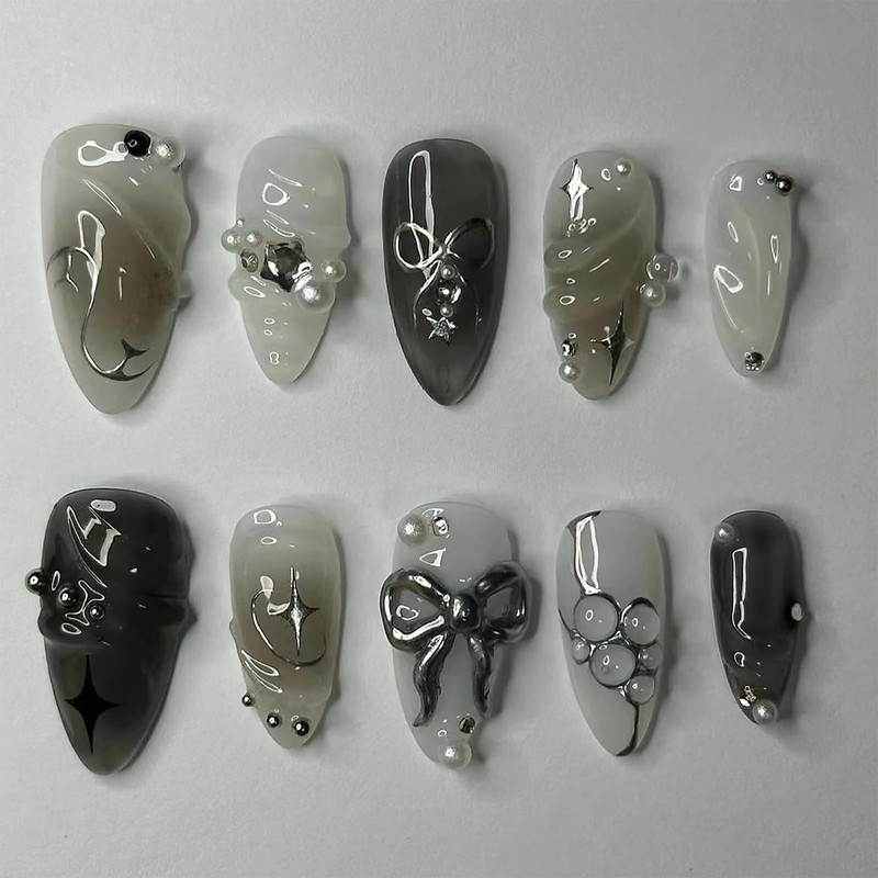 Yamobi Pack of 24 Black Press-on Nails Medium Almond Fake Nails with 3D Metal Bow Beads Design, Black Gradient, False Nails, Water Drops