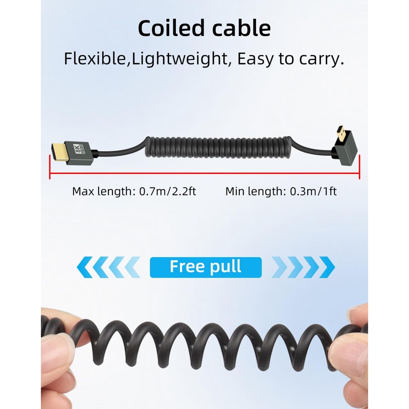 • 【Ultra Flexibility】The spring spiral Micro HDMI cable's coiled design allows for flexibility and easy storage, which is a significant advantage over traditional straight cables.It is especially suitable when you need both flexibility and compact cable routing. Micro HDMI cables are rolled in a loop to prevent clutter, the unstretched length is 1FT and can extend up to 2.2FT.
