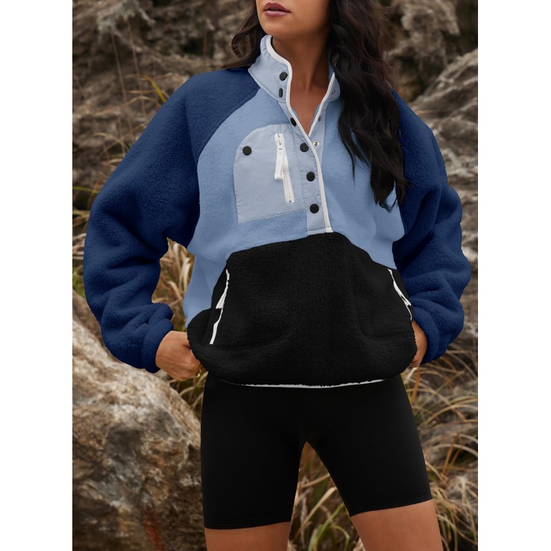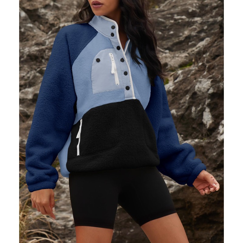 - Features: Womens fleece jacket with contrast bust pocket and color block detailing for a fun touch, fuzzy fleece pullover women with lapel collar, quarter button up and two zip side pockets design makes you dress up and down easily
