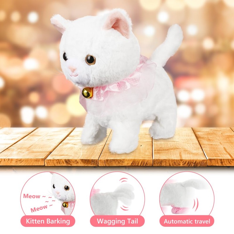 • Voice and touch interactive: cuddly toy cat white. When your babies talk to cat or touch their head slightly, they can also bark and wag their tail and head. Can run, make noise. Interact with children and develop empathy and caring qualities