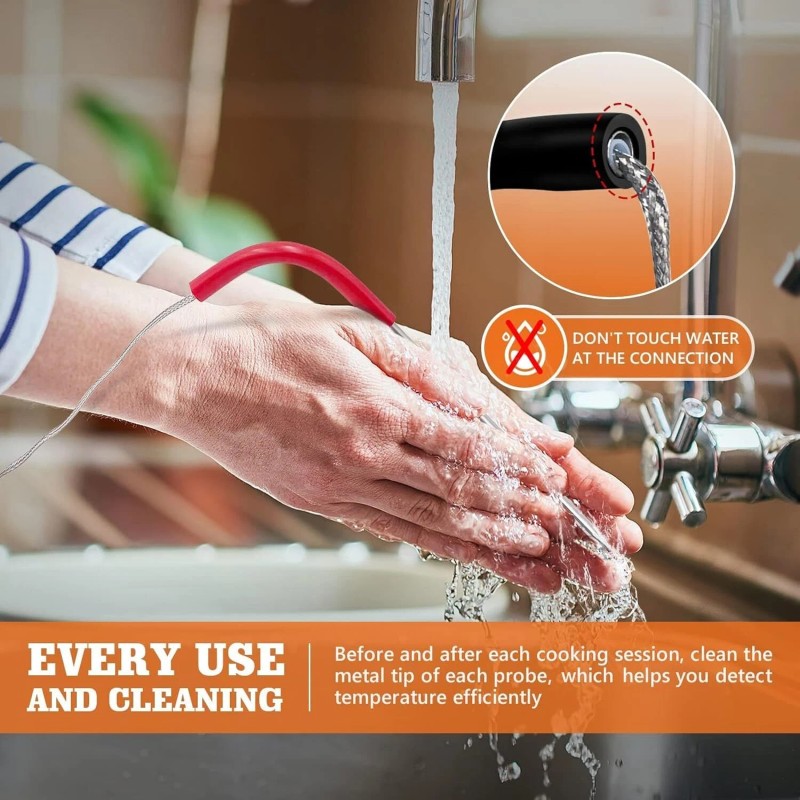 • EASY TO CLEAN AND USE: 3.5 mm plug-in meat probe, plug and play. The waterproof temperature meat probe tip is washable with water, helping to measure meat temperature more accurately each time. Plug and cable are not water washable