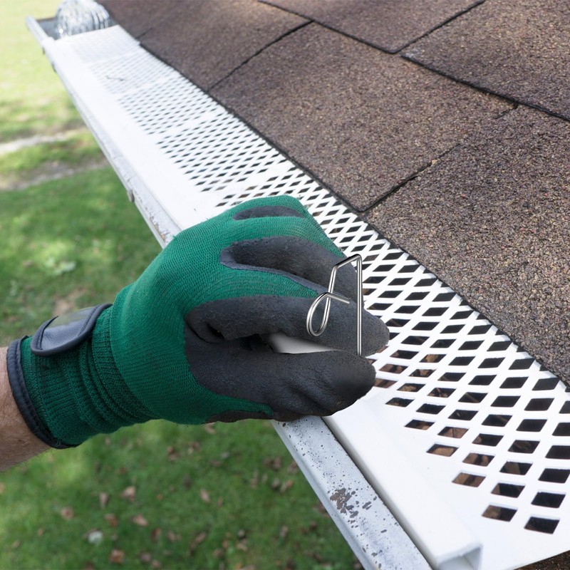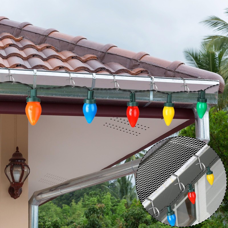 - Easy to Install: stainless steel string light hooks for outside can slide down into the holes of your gutter guard, and by using your fingers, you can crimp the hook to the christmas light wire, holding it securely in place, the recommended quantity is one gutter hook placed every 6 inches on light strings