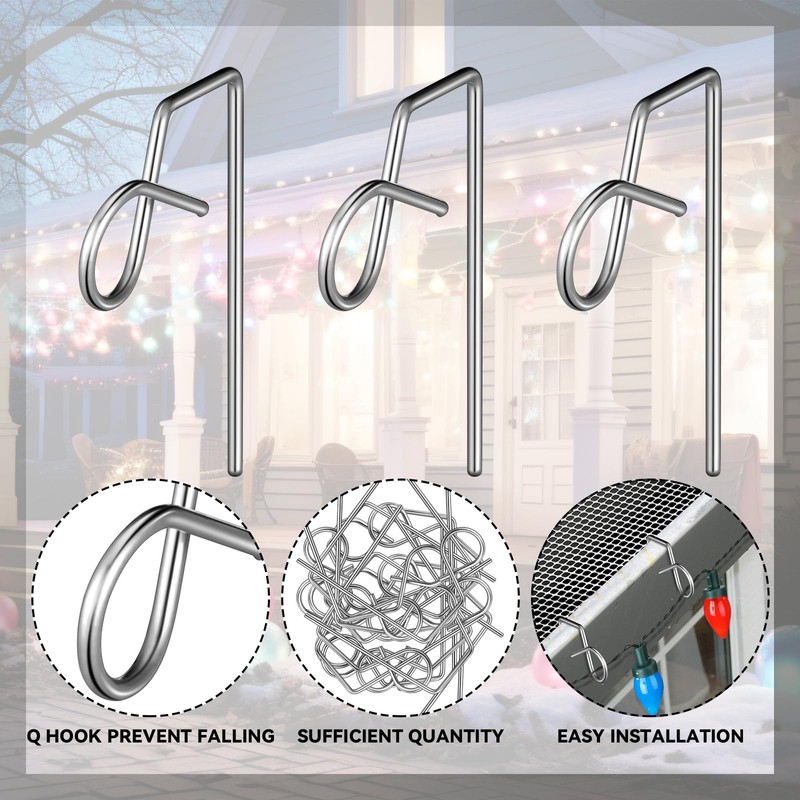 - Q Hook Design: the unique Q hook design of these stainless steel Christmas light hooks ensures a secure grip on your decorations; The curved shape prevents hanged items from sliding, providing a safe environment for your Christmas decor