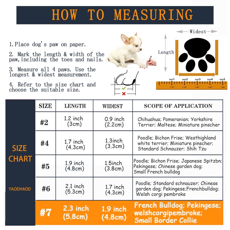 - 🐕Choose the appropriate size: Size 5 - 1.96''x1.59''(W*L).Method: Place the pet's paws on paper; Mark the width of the claws, including toes and nails; Measure all claws and use the widest size; Refer to the size chart and select the appropriate size.
