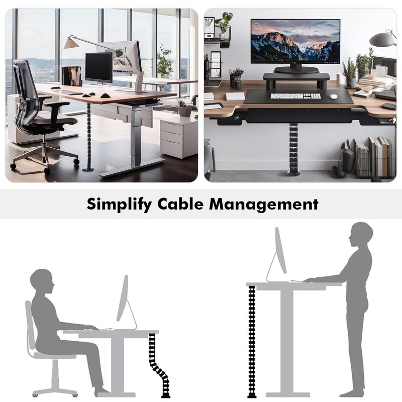 - Family-safe Cable Protection Design: our standing desk cable management kit Features nylon cable ties with reinforced stitching and smooth, rounded stick-on cable clips to minimize risks from curious pets or toddlers; The hidden under-desk routing keeps cables out of reach, while the snug clip-and-strap system prevents dangling wires that might attract paws or little hands