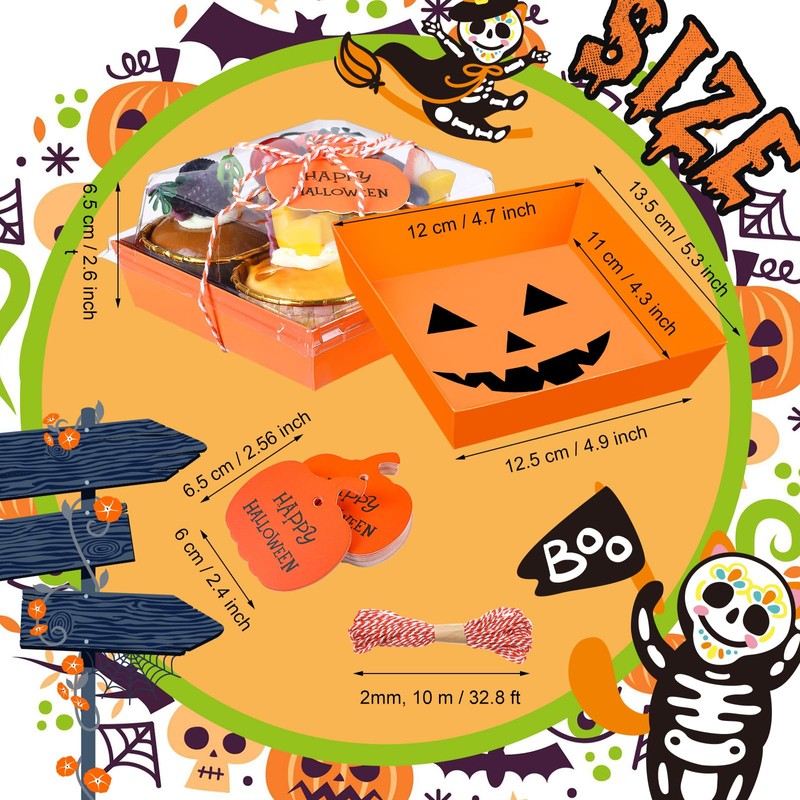 Features:Attractive Colors and Design:Our pumpkin charcuterie boxes are available in vibrant orange color and designed with a Halloween theme, they perfectly blend with the festival's thrilling mood, enhancing the overall aesthetics of your party setupEnsured Safety and Convenience:Our Halloween charcuterie boxes are made of safe materials that pose no risks to food completeness. They are also designed with convenience in mind, offering easy assembly and packaging.Specifications:Material:Charcuterie box: cardboard, PET plasticRope: polyester cottonCard: paperColor of box: orange with clear lidSize:Charcuterie box: approx. 5.3 x 4.9 x 2.6 inches/ 13.5 x 12.5 x 6.5 cm in top sizeRope: approx. 32.8 ft/ 10 meters long with 0.08 inch/ 0.2 cm in diameterCard: approx. 2.4 x 2.6 inches/ 6 x 6.5 cmPackage includes:50 x Charcuterie boxes with clear lids3 x Ropes50 x CardsNotes:Manual measurement, please allow slight errors on size.The color may exist a slight difference due to different screen displays.