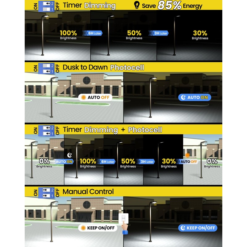 - đź’ˇTimer Dimming & Dusk to Dawn Photocell - The Flood Light features built-in Timer Dimming for Auto adjust brightness. For the first 6 hours, the brightness is set to 100%, it decreases to 50% after 6 hours, then to 30% after 3 more hours until OFF. The Photocell detects ambient light, and then control the Flood Lights Auto OFF at sunrise/day and Auto ON at sunset/night. Easily disable Timer Dimming and Photocell functions by sliding the switch to OFF. YRABO LED Flood Light offer versatile and cost-saving lighting, saves your electricity bills up to 85%.