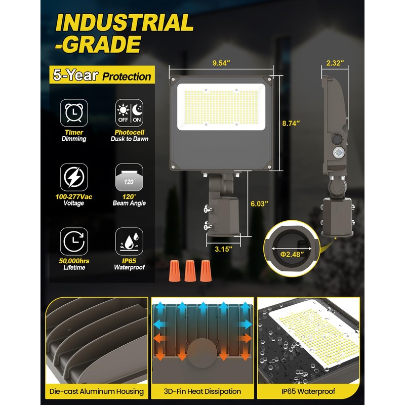 - 💡Slip Fitter 180° Adjustable - YARBO Flood Light have pre-installed an 180° adjustable Slip Fitter Bracket with Inner diameter 2.48 inches, suitable for round poles. Easy to install, just fix the Slip Fitter to the round pole, then tighten the screws. 120° Large beam angle Outdoor Flood Lights with the biggest coverage are perfect for parking lots, walls, yards, barns, streets, lawns, parking lots, basketball courts, tennis courts and other outdoor places.