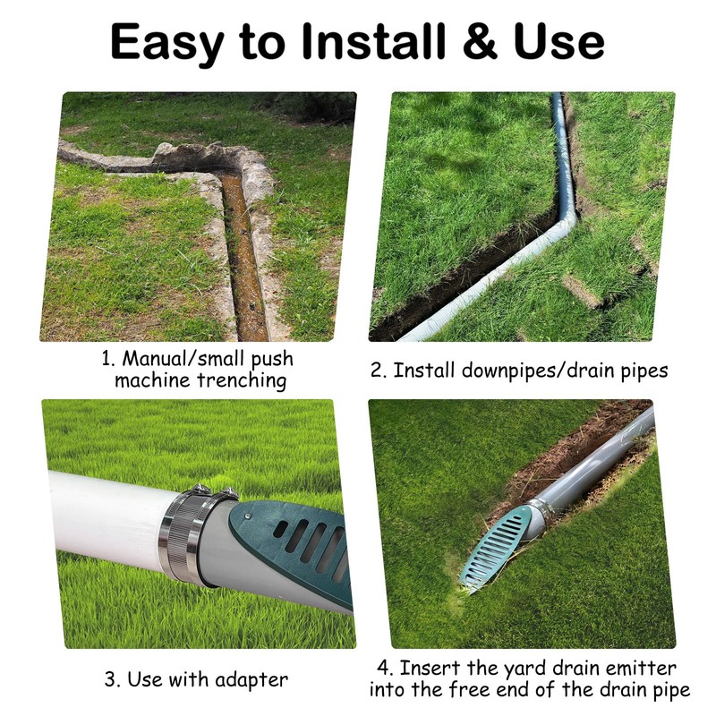 - Quick, Simple Installation: Use a hand trencher or a small walk-behind machine to dig the trench, then install the downspout line. Simply insert the yard drain emitter into the end of the drain pipe (an adapter may be needed), and your yard drainage systems will be set up and ready to go.