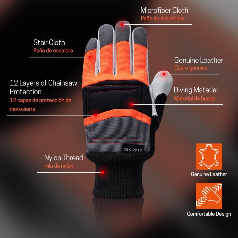 - Certification Guarantee -- The classic chainsaw gloves are CE certified. Meet ENISO 11393-4 standard Part 4, Saw protection Class 1(20m/s), according to EN388.