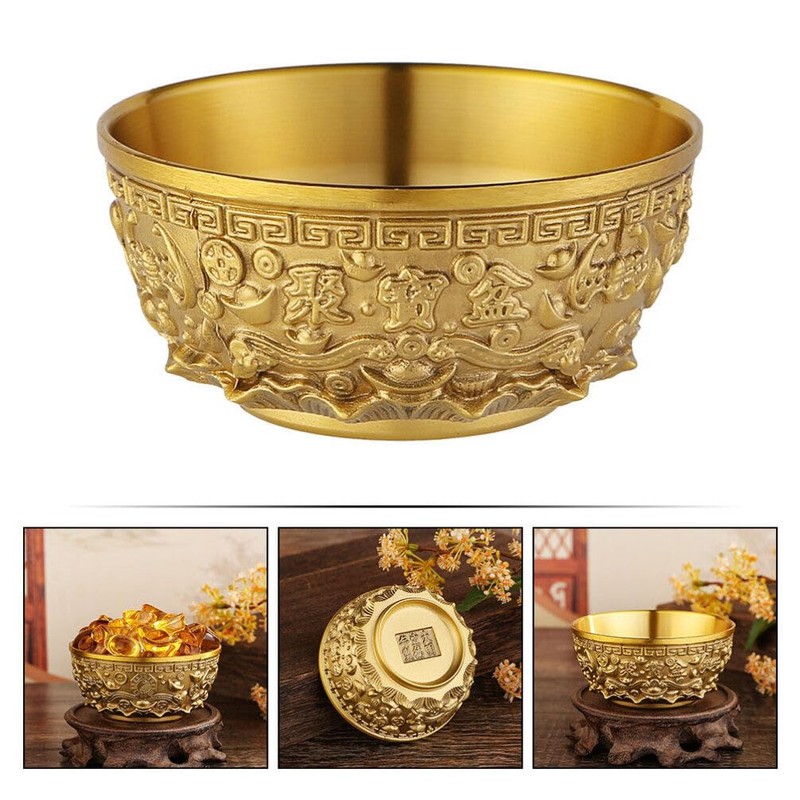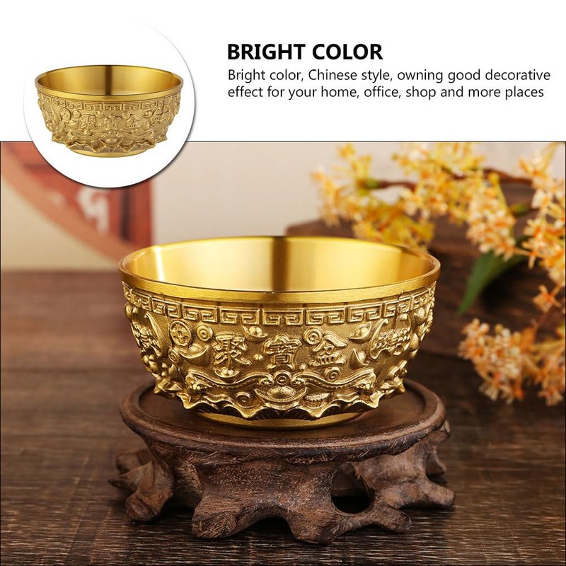 This exquisite sacrificial bowl is made of durable brass and suitable for long-term use. With delicate treasure basin design, bright color, very unique and fashionable, perfect as a chic gift choice for family members and friends to share more joy with them.