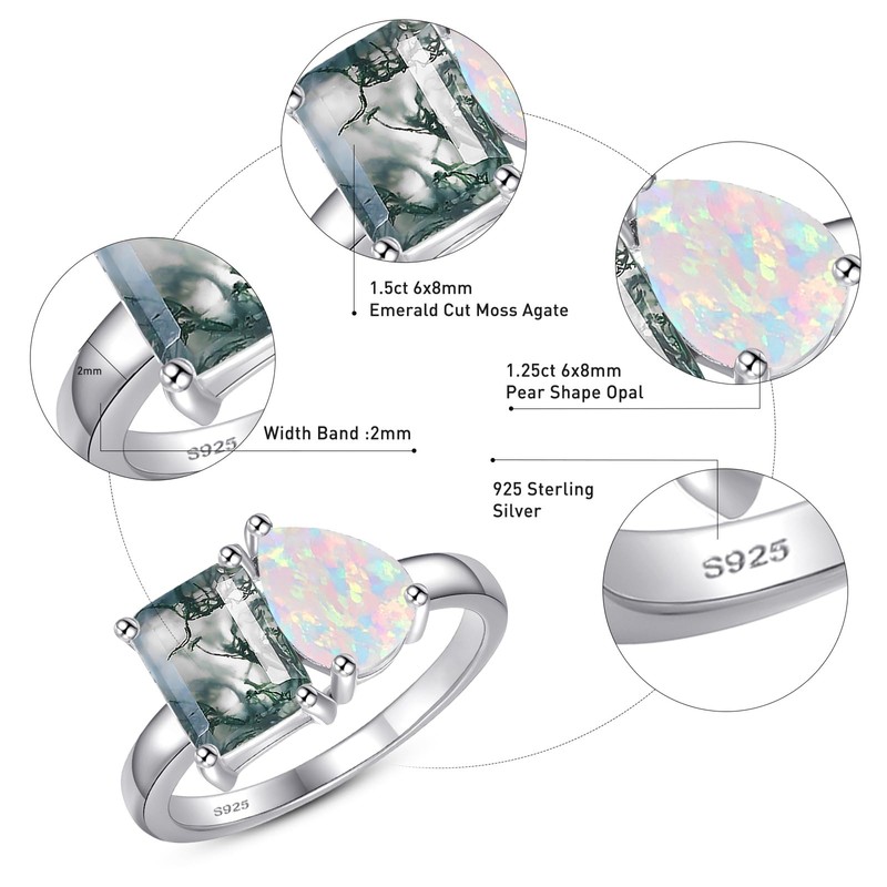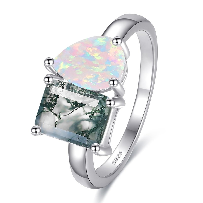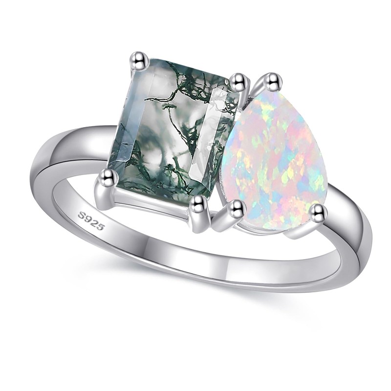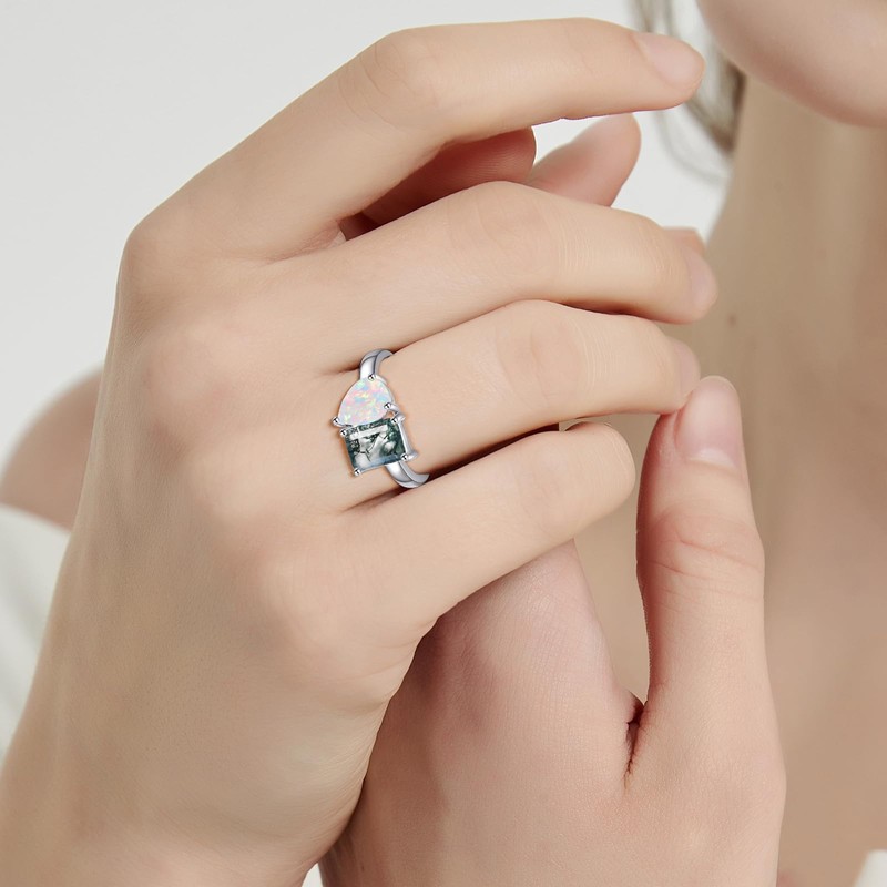 • Captivating Gemstone Combination: Featuring a 1.5ct 3-prong Pear-Cut simulated opal with a 1.5ct 4-prong Emerald Cut Moss agate, this two-stone ring creates a mesmerizing contrast, elevating its overall elegance and visual appeal.