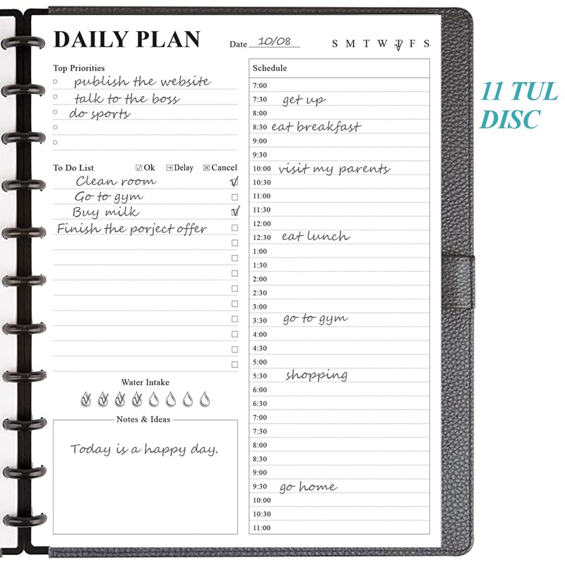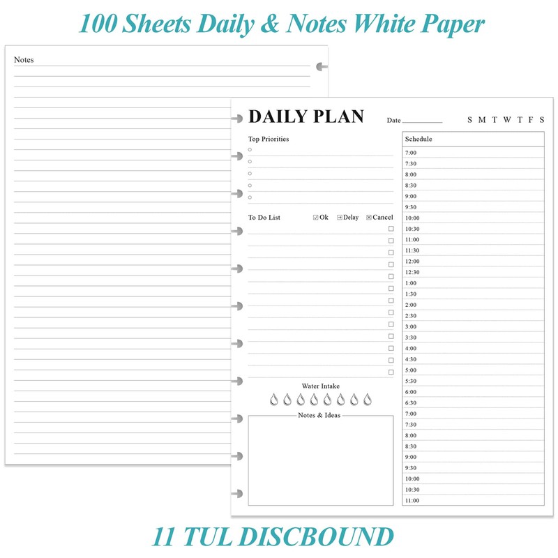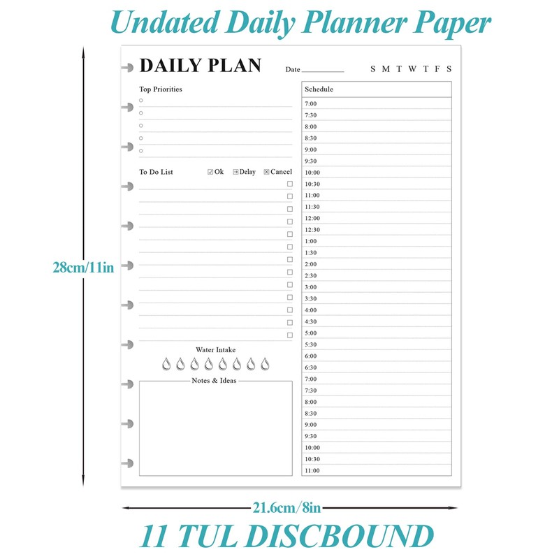 This daily planner refill is undated, size of ." x ", you can start using it at any time without wasting a page. This refill planner with sheets/ pages for days. With compatible with Staples Arc, Office Depot TUL, Talia, Levenger, Happy Planner, and other discs letter size discbound notebooks. The daily refill paper is used to high quality gsm pure white premium acid-free paper, so you can confidently use most pens, pencils, and markers without ghosting and bleed-through.day planner refill page includes space for top priorities, to do list, daily schedule from am-pm, notes&ideas and water intake. This to do list planner refill con help you to save time and achieve your goals.