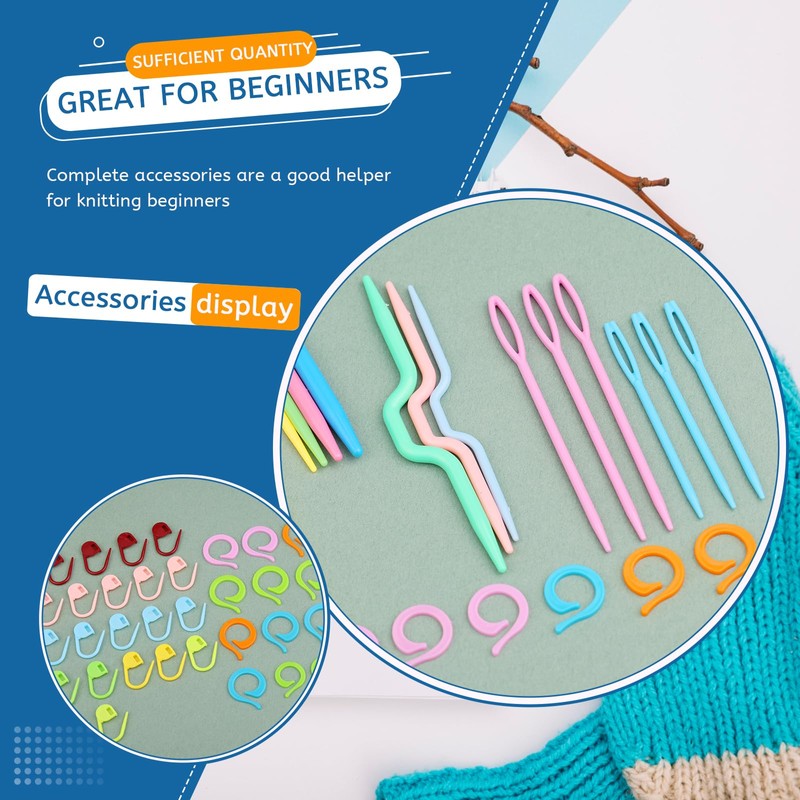 - Knitting Set Specifications: There are 1* ball winder, 4* U-shaped needles, 20* marking rings, 20* stitch markers, 6* plastic yarn needles (3*7cm, 3*9cm), 3* bow needles.