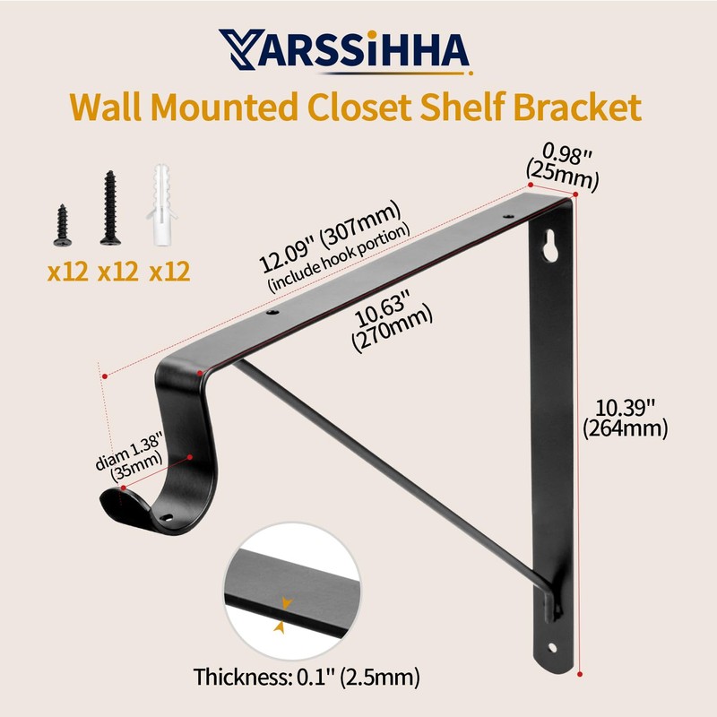 - Size & Specification: The dimensions of our closet brackets are 12.09"L (include hook portion) x 10.39"H x 0.98"W, thickness are 0.1" (2.5 mm). The closet rod support brackets fit for rods with up to 1.38" diameter, can hold up to 260 LBS per pair. U-shape design hook with hole at the bottom can lock the rod firmly