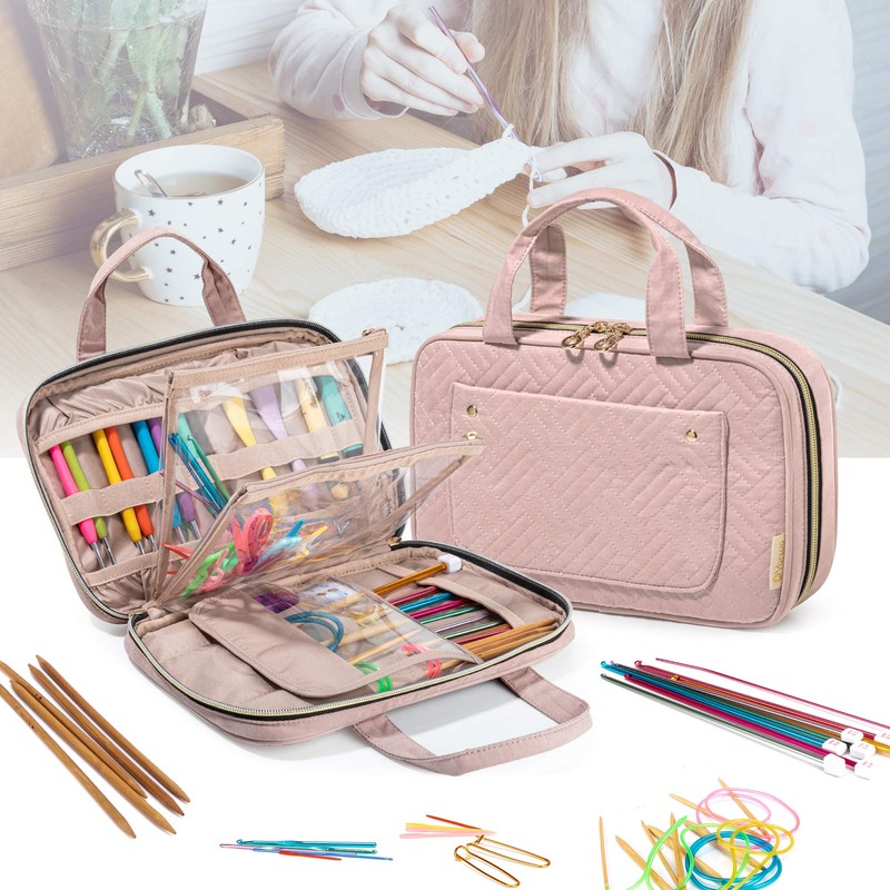 - Double Handle - 28 x 18 x 4 cm. Double handle design make it easy to carry for traveling, taking crochet class or daily crafting. Nice choice to crochet enthusiasts and knitting beginners on holidays