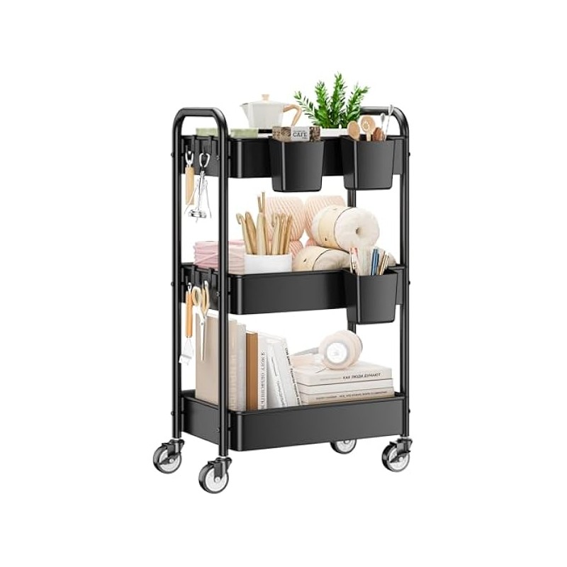 YASONIC 3 Tier Rolling Cart - Metal Utility Cart with Wheels, Hanging Cups, Hooks, Heavy Duty Mesh Rolling Storage Cart Organizer, Craft Cart for Kitchen Office, Lightweight and Sturdy