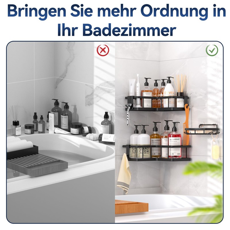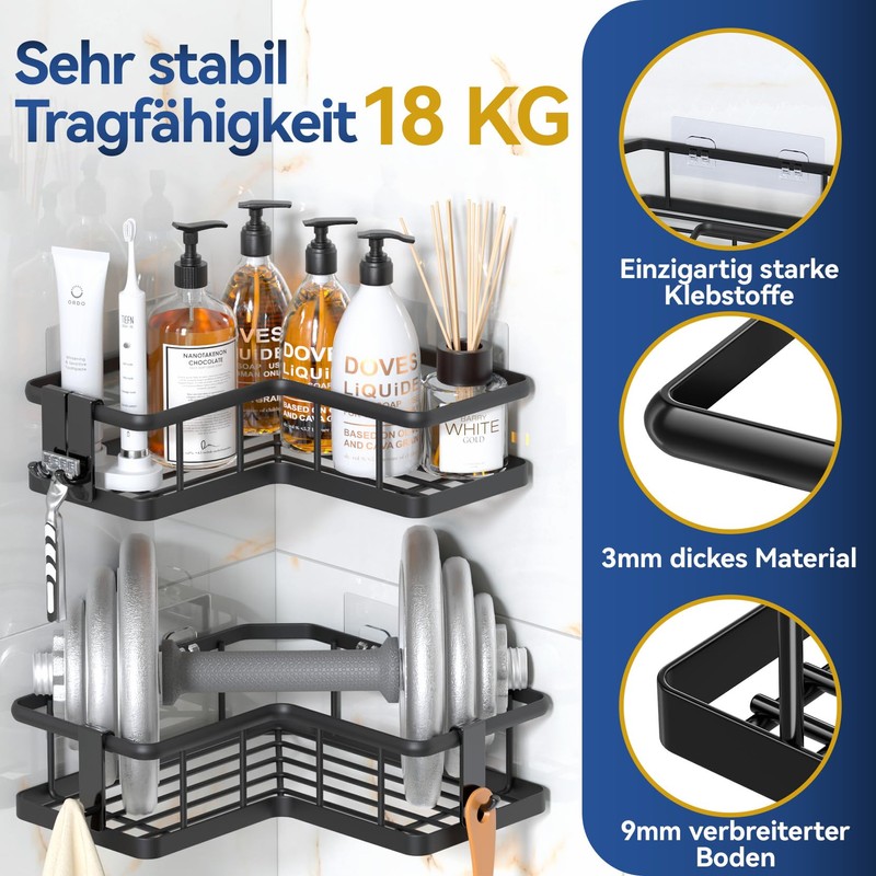 - 90° shower shelf corner and large capacity: shower shelf without drilling has a right-angled 90° design that fits perfectly into the corner and maximises the use of space in the bathroom corner. The right angle design has a larger capacity and can hold more items. Corner shower shelf saves space and keeps things tidy