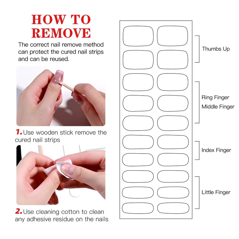 - Easy Application & Removal: Our semi-cured strips are incredibly user-friendly. Simply prep your nails, apply the strip, shape it to fit, and cure it using your preferred UV lamp. When it's time for a change, removal is a breeze – no harsh chemicals required!