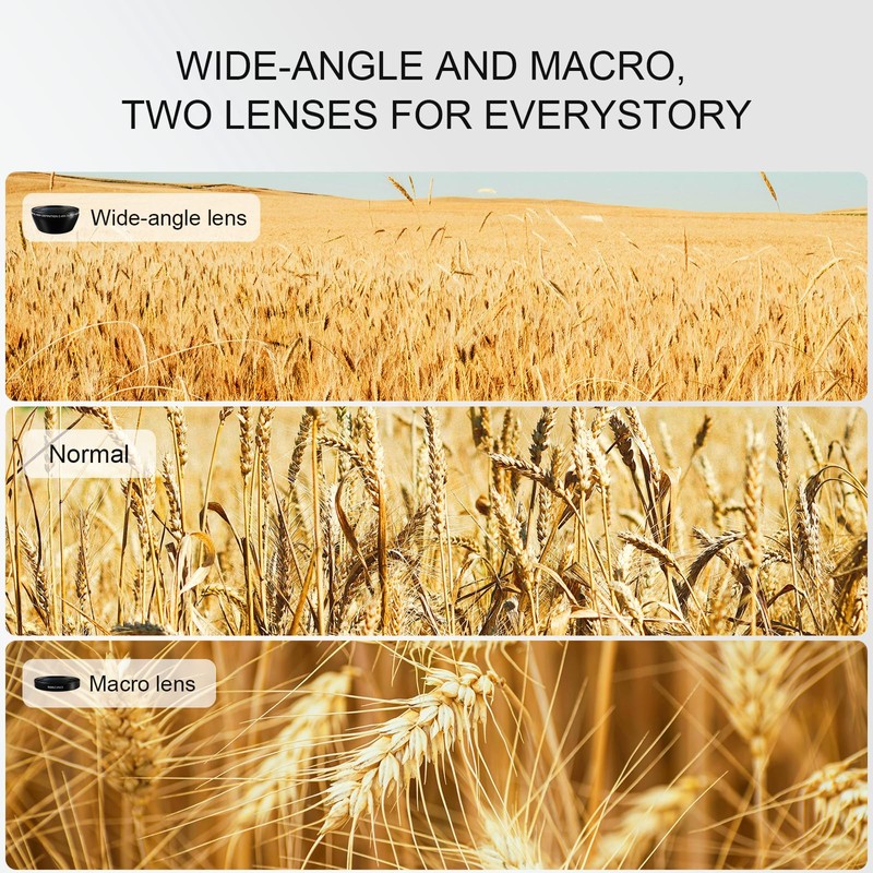 - Dual Perspectives, Endless Creativity:The combination of wide-angle and macro lenses offers dual perspectives, stimulating your creative inspiration.Equipped with a wide-angle lens, capture a broader view.The macro lens allows you to explore the microscopic world, capturing the beauty of details, from the texture of flowers to the wings of insects, all within your grasp