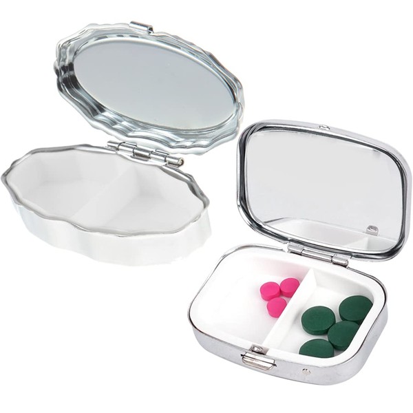 YATEICBC 2 Piece Stainless Steel Pill Box Pill Box with Two Separate Compartments - Pill Box for Travel Pills - Silver Box, Rectangular and Wavy