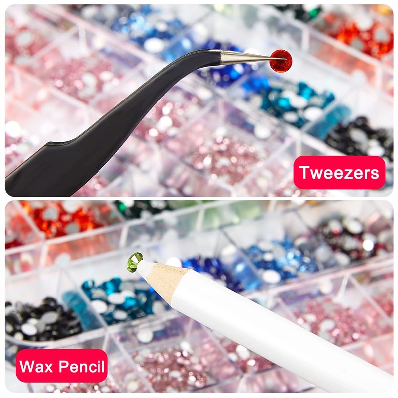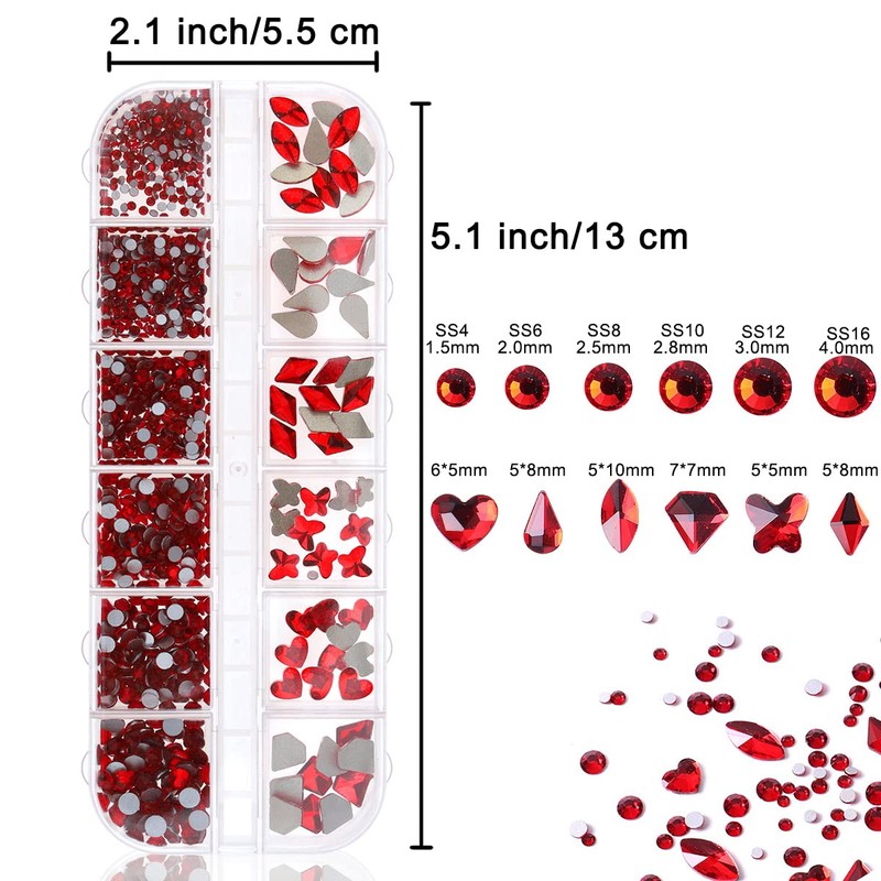 - [Nail Art Rhinestones] The number of gems in the package is about 810 flatback rhinestones in 6 sizes, multi-shaped red rhinestones and round gems. 1 piece of wax pencil and 1 elbow tweezer are also included. Nail gems durable sparkling and brightness. Good for nail art delicate decorations.