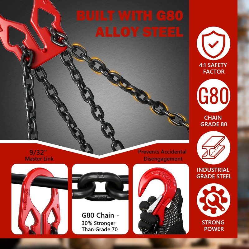- 2.【INDUSTRIAL GRADE G80 ALLOY STEEL】Built to last, this entire chain sling set is constructed from heat-treated Grade 80 alloy steel, providing a reliable 3500 lb load capacity per leg and exceptional resistance to wear, shock, and deformation