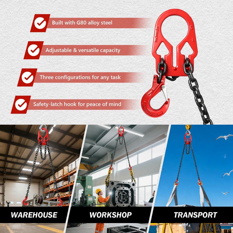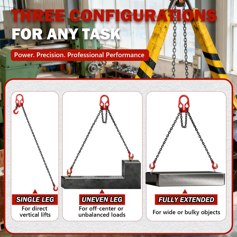 - 5.【COMPLETE & VERSATILE 10-FOOT KIT】This ready-to-use kit includes 10-foot legs with the master link and hooks attached. It supports multiple configurations (single leg, double leg) for vertical lifts, off-center loads, and wide objects