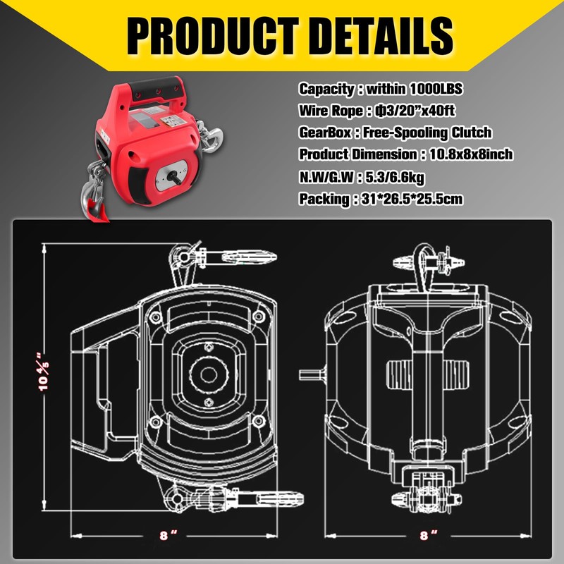 - 👍Portable & Powerful - The portable drill winch weighs only 11 lbs and is easy to carry and can be easily used and operated by one person. With a maximum single-line pulling capacity of 750 lb ~ 1000 lb, the 40-foot high-quality steel wire can be used for vertical and horizontal traction, which is very reliable.