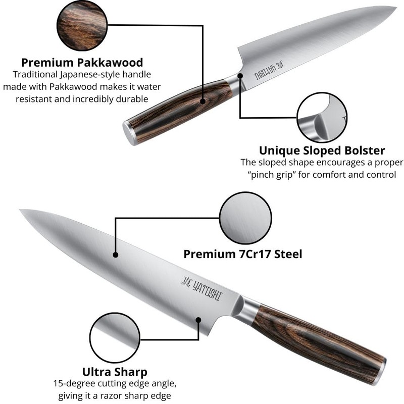 - High Carbon Blades: Made with premium 7Cr17 High Carbon Steel, which provides a razor-sharp, professional-quality blade. The steel contains 0.6-0.75 carbon, making it two times tougher than other knives in its class with a Rockwell Hardness of 57-58.