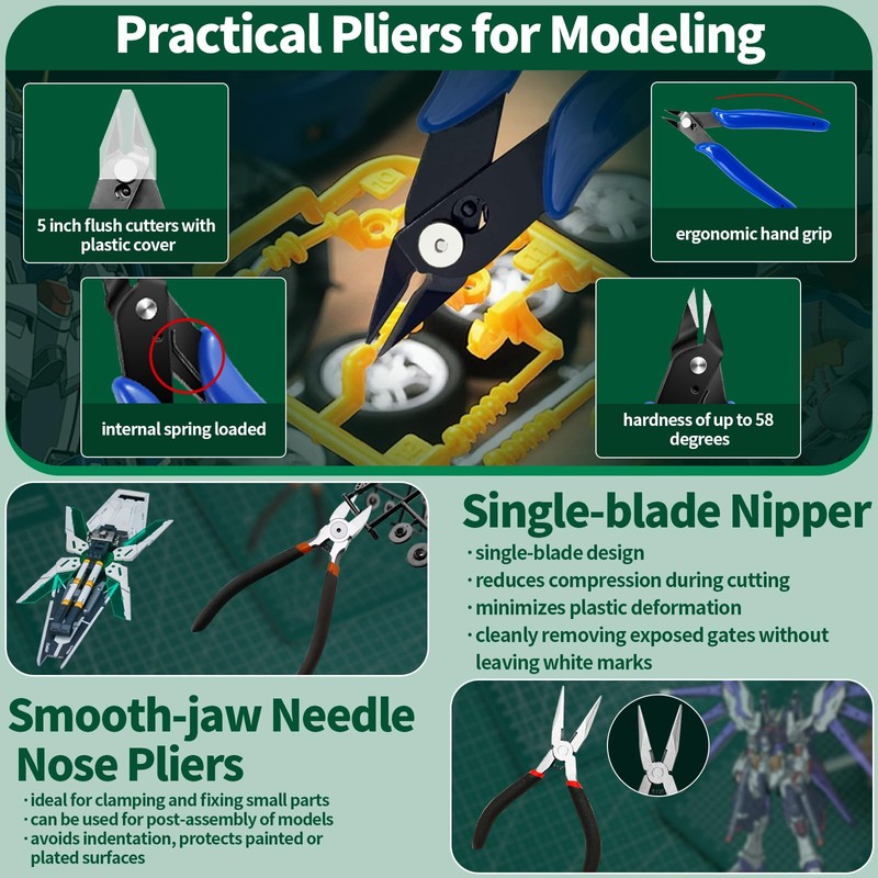 - [Essential Plier For Model Building] The pliers set is made of high-frequency hardened carbon for durability, rubber handle for comfotable grip. The flush cutters and single-blade nipper can be used for cleanly removing exposed gates without leaving white marks; The needle pliers can be used for clamping and fixing small parts, adjusting the angle of wire, copper rods or articulated joints.
