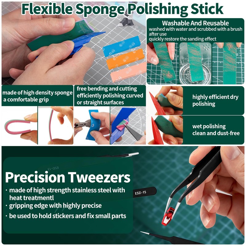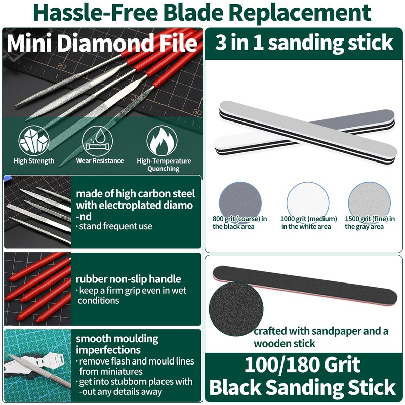 - [Full-in-One] The modeling hobby tools set contains side pliers, 1pc craft knife & 5pcs #11 blades, 2pcs precision tweezers, 6pcs sponge sandpapers, anti-cut resistant finger cot, cleaning brush, modeling clay, 5pcs mini diamond files, steel ruler, 3 in 1 sanding stick, 100/180 grit black sanding stick, metal stencil, glue applicator, model separator, model sculpture pen with 3pcs replacement tips, scissors, 6pcs model coloring clips, fluid ruling pen.